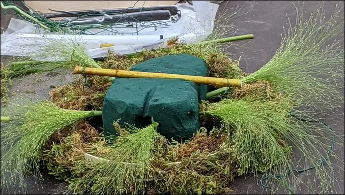 On commence par cacher l’oasis avec de la mousse et quelques graminées (Panicum elegans).