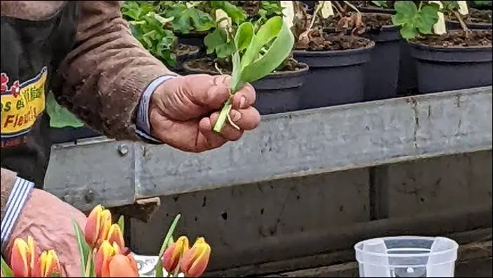 Les tulipes sont tigées et piquées avec un pré-trou. Les feuilles sont pliées pour faire une boucle et insérées entre les fleurs (voir ci-dessus).