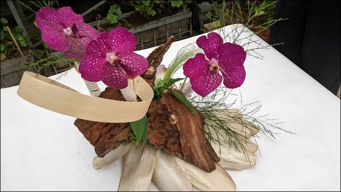 On y ajoute quelques petits œufs en chocolat piqués dans l’écorce. 3 orchidées (Vanda) sont insérées dans les réserves d’eau.