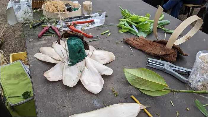 A gauche, la base est constituée d’une plaque de polystyrène sur laquelle est fixée la base d’une bouteille plastique servant de réserve d’eau pour l’oasis. Des enveloppes de pousses de bambous aplaties servent de décor nacré. Un montage d’écorce et de piques permettra de venir fixer la partie supérieure composée d’écorces (posée à droite).