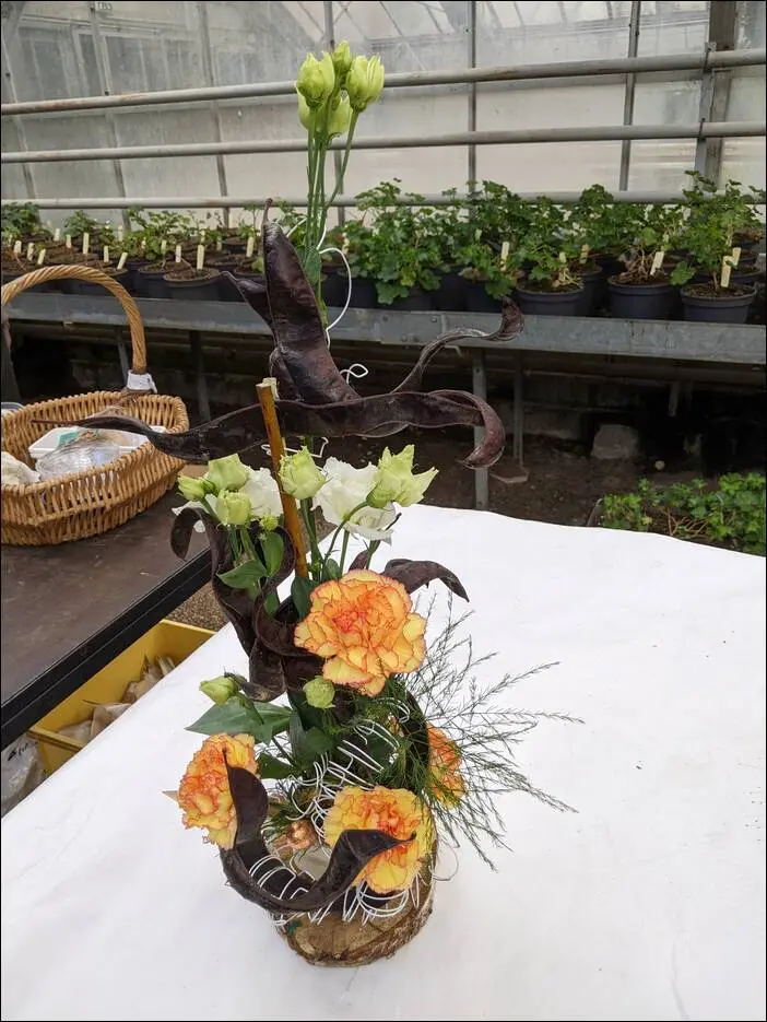 L’oasis est déposée dans un récipient rectangulaire. Jean-Claude y a fixé des tiges de saules entrelacées d’une feuille d’Areca (sorte de palmiers) et de 2 demi coquilles d’œufs. Une peu de mousse entoure les extrémités de l’oasis.