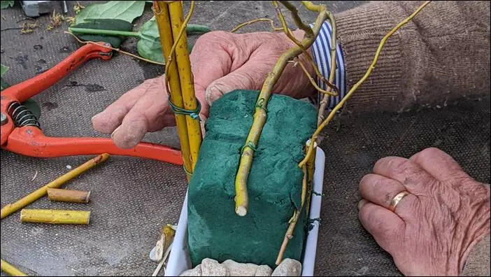 Dans un récipient suffisamment long, on dépose un pain d’oasis et on fixe des branches de saules (3 à la verticale et quelques autres à l’horizontale.