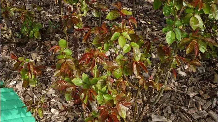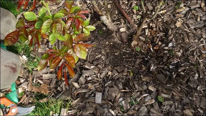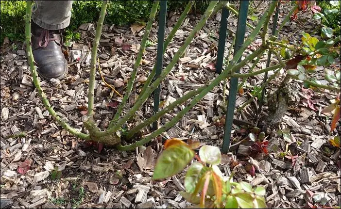 Au pied du rosier, on observe également de nouvelles pousses rougeâtres. Elles constitueront la relève pour la floraison de 2027.
